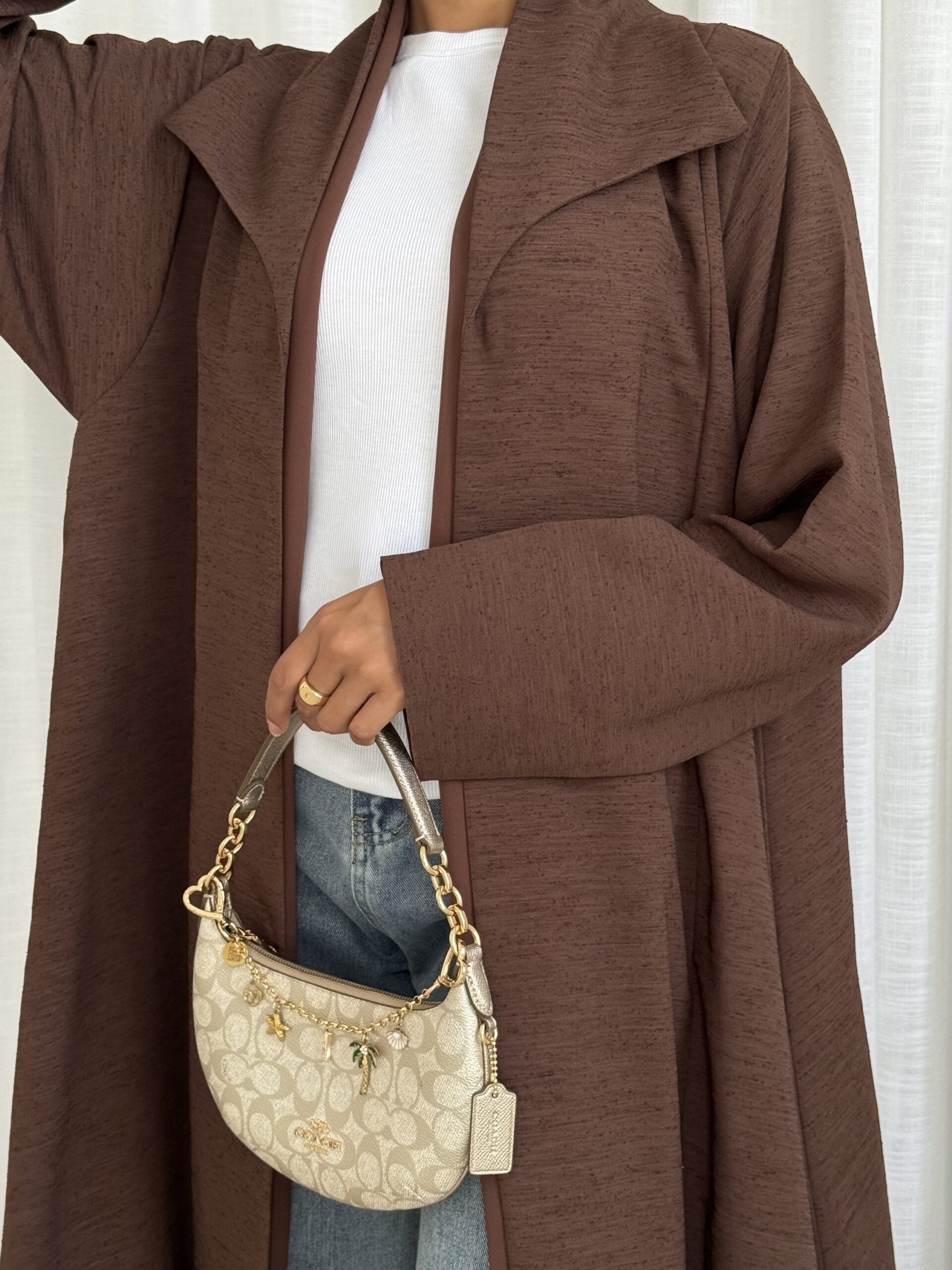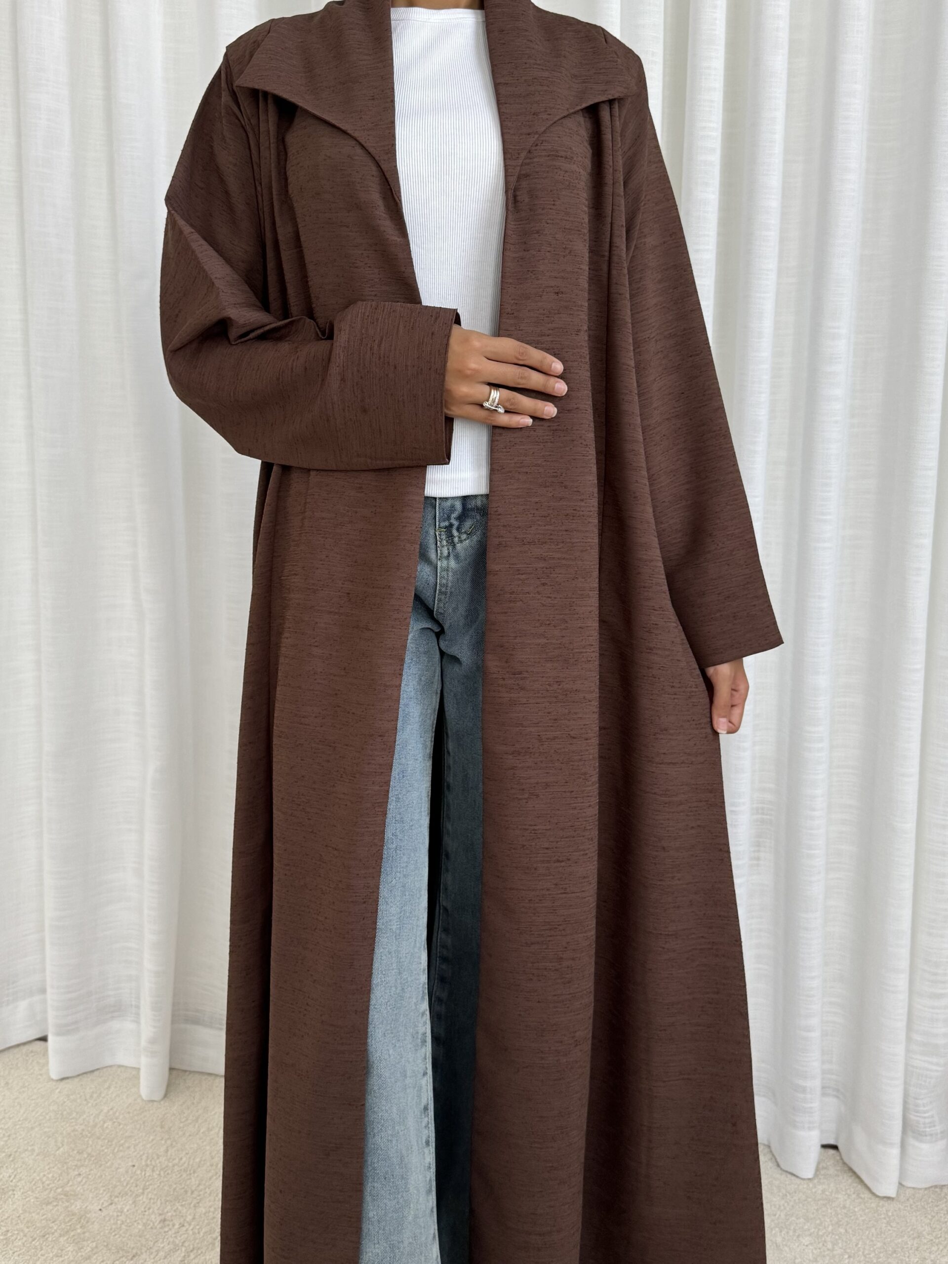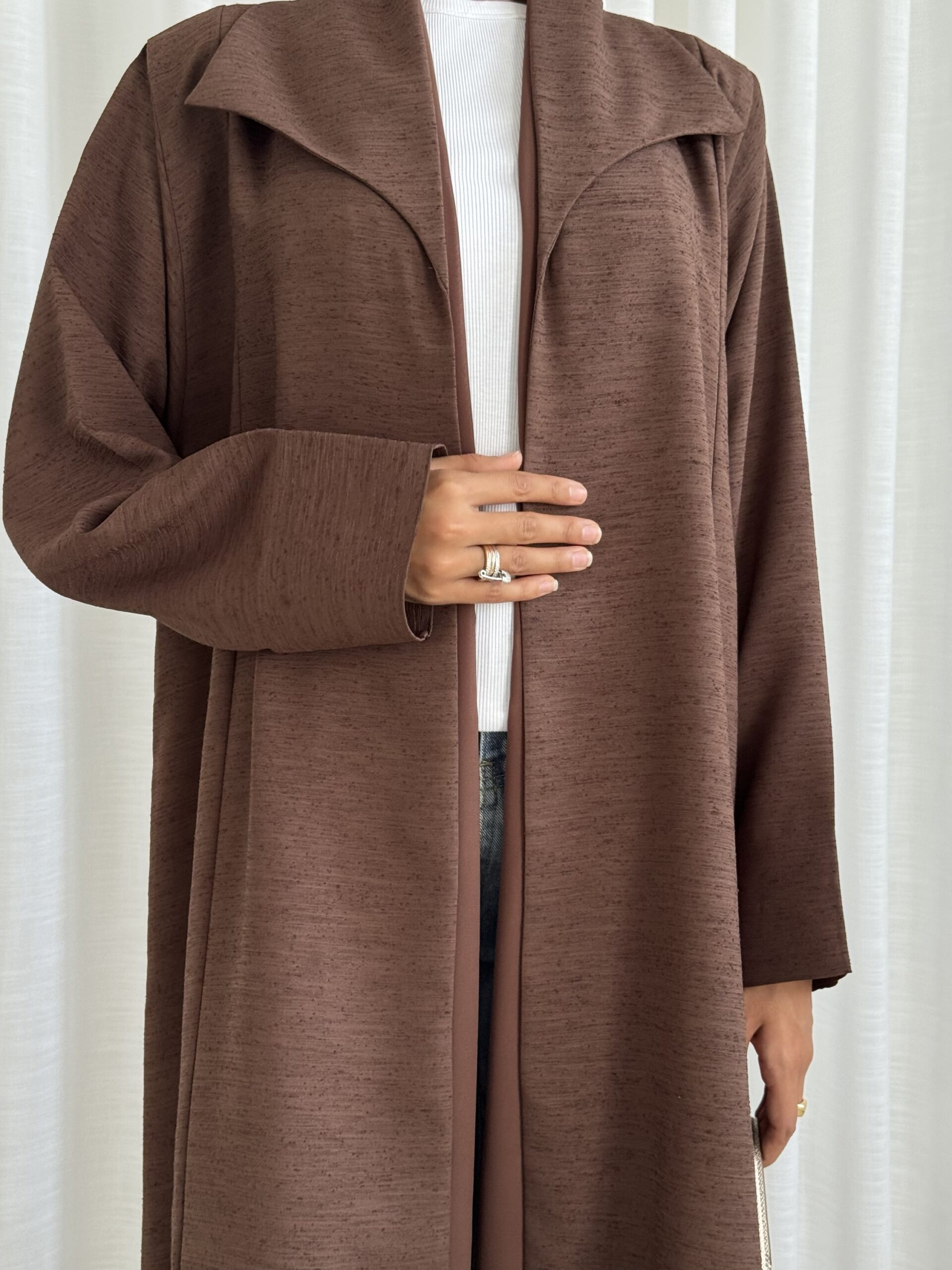 A soft-textured mocha brown abaya with subtle patterns and a structured collar, giving a modern yet understated elegance.