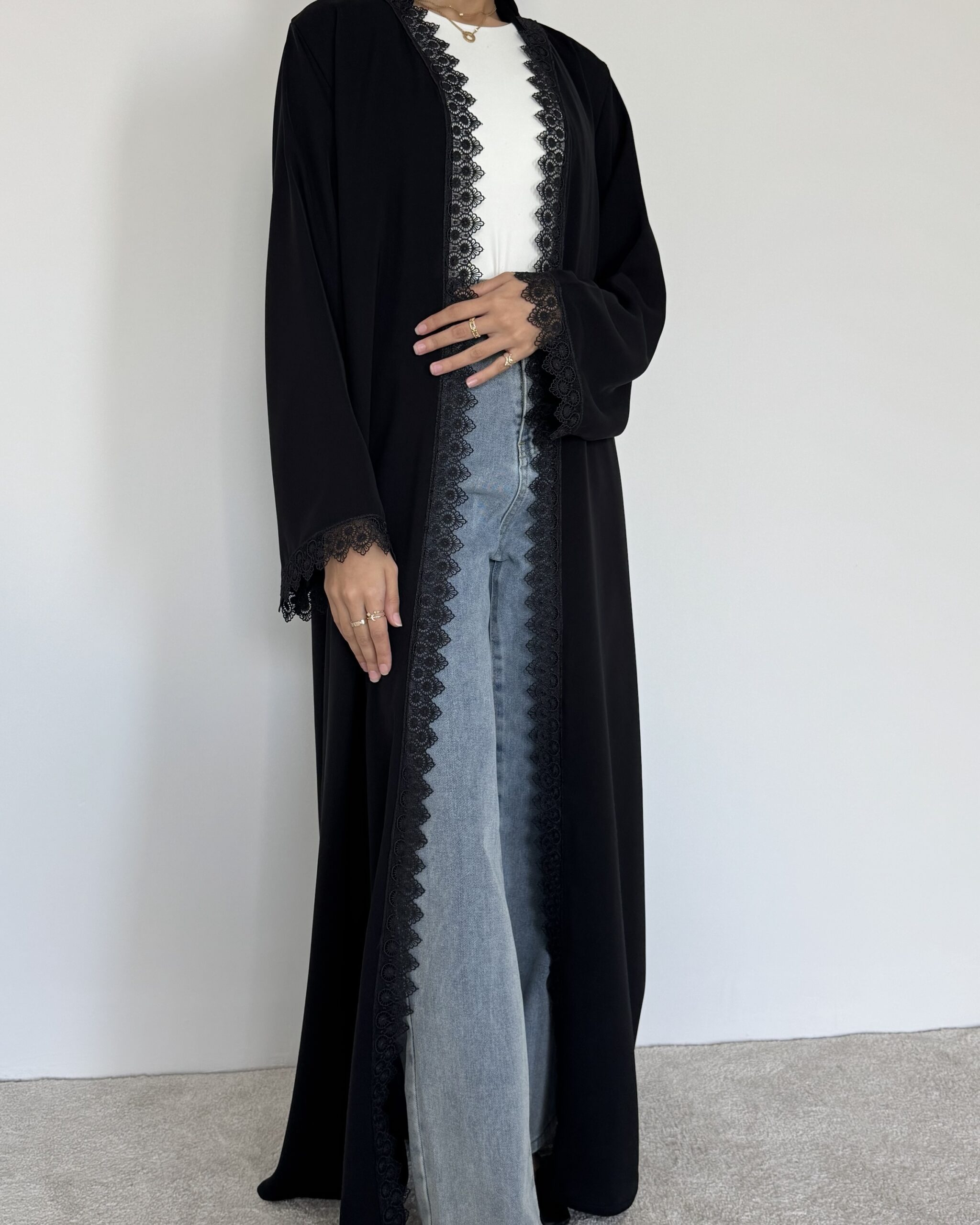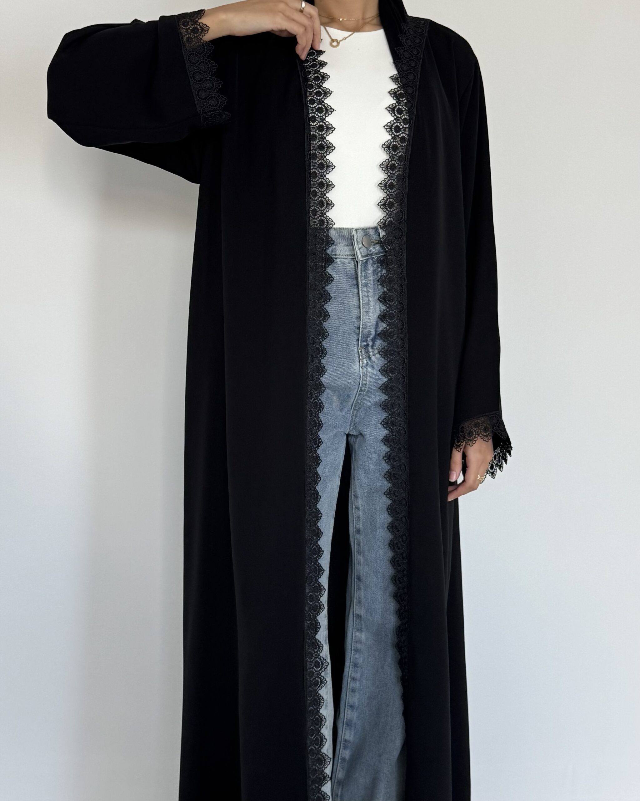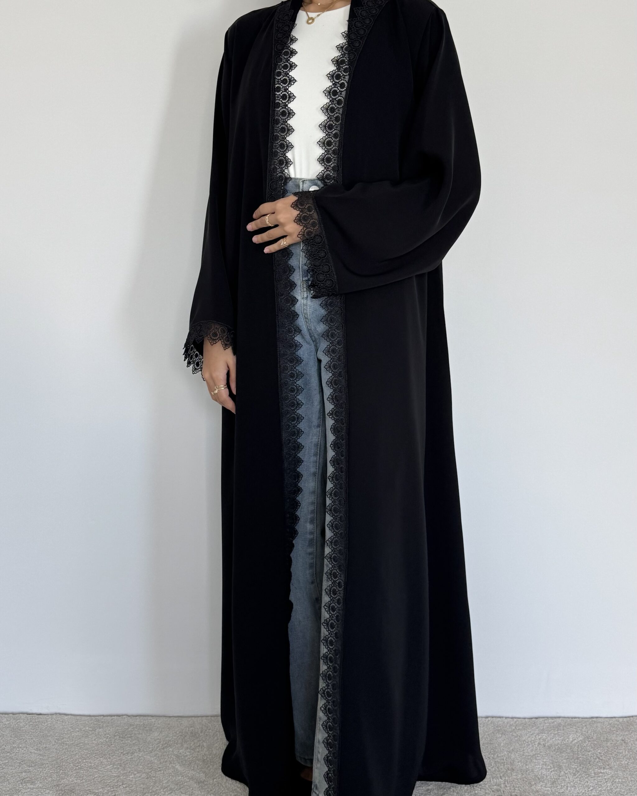 Elegant open abaya finished with delicate lace detailing. Lightweight, feminine, and easy to style for any occasion.