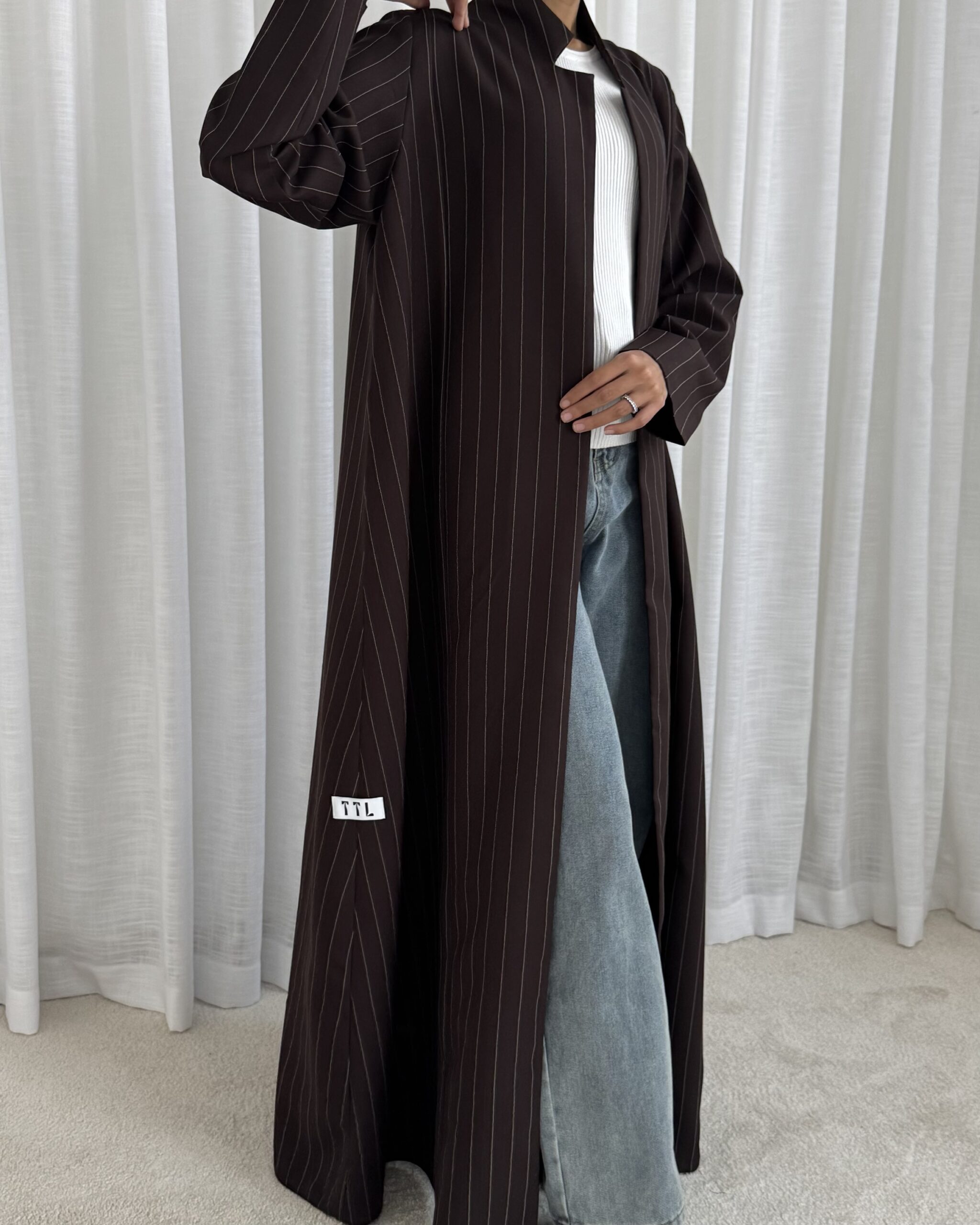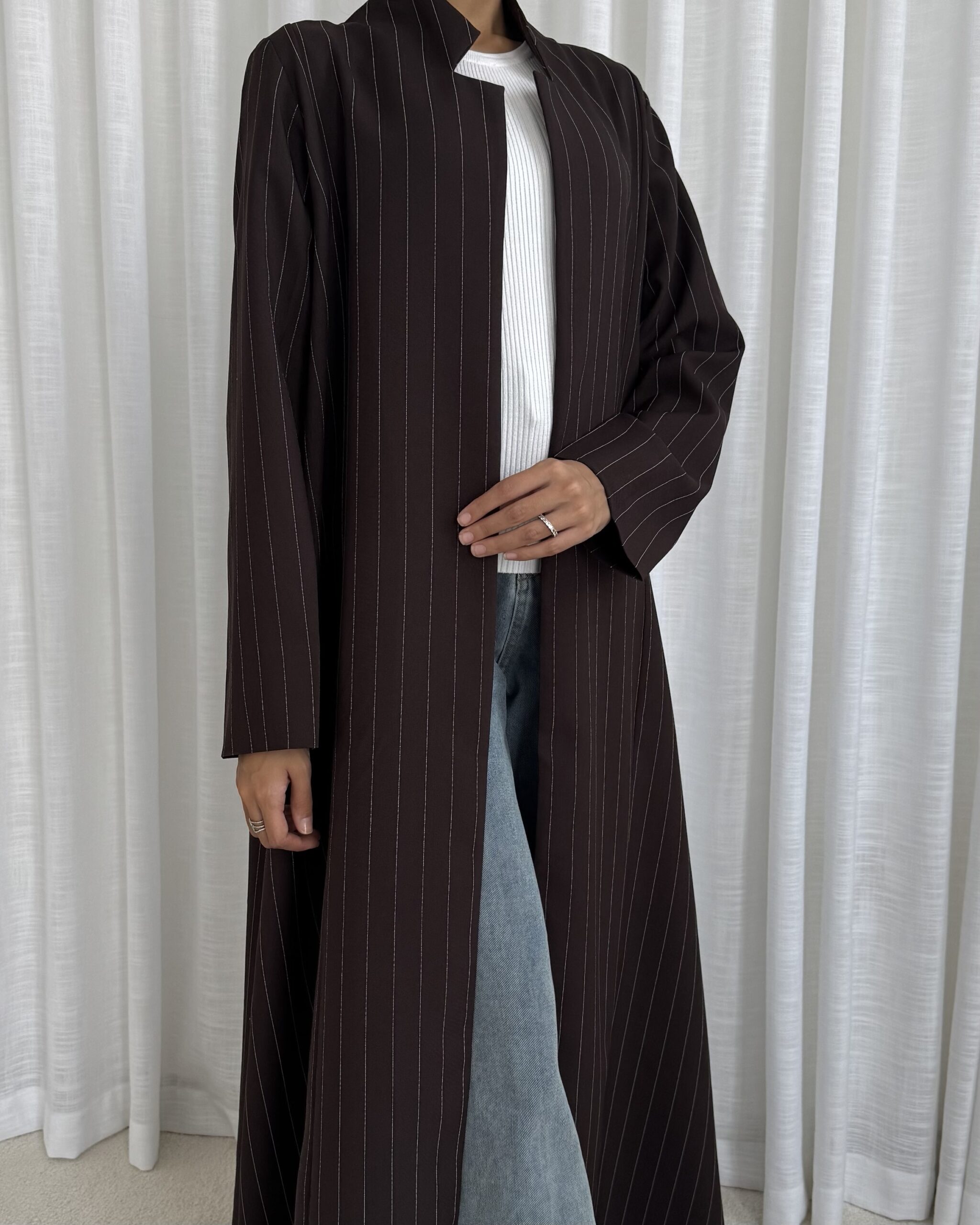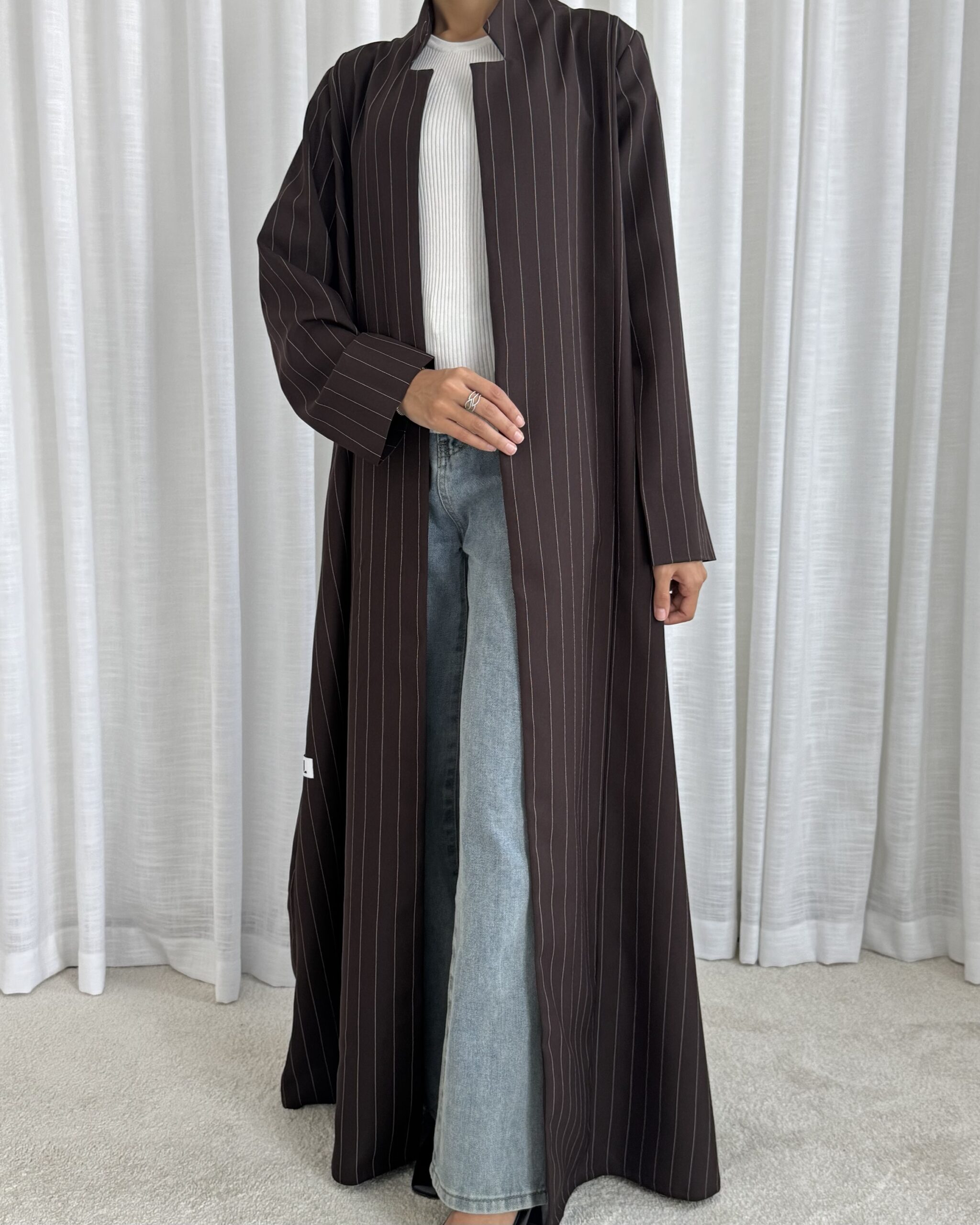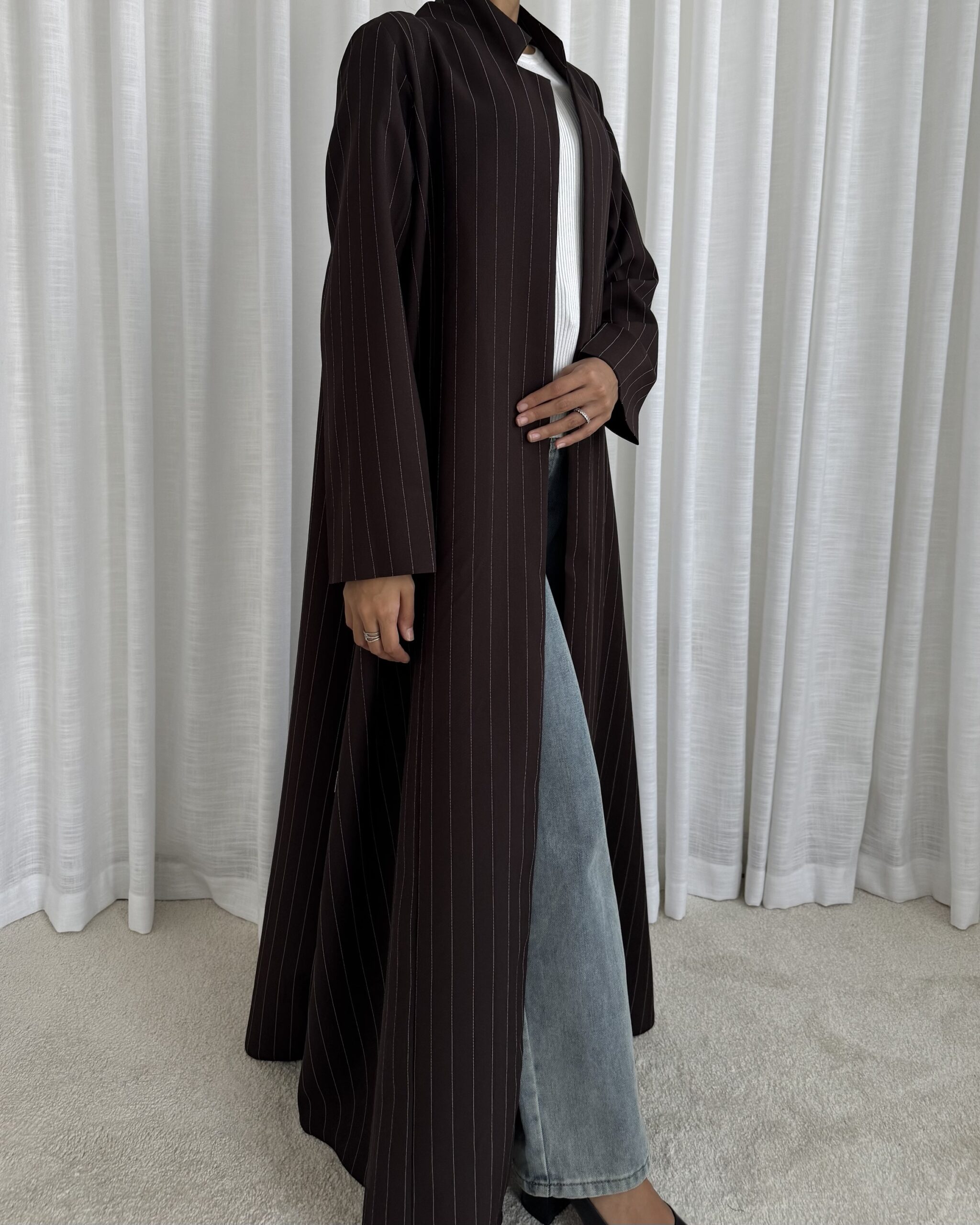 Smooth, subtle, and effortlessly chic — a rich brown striped abaya with a modern finish.