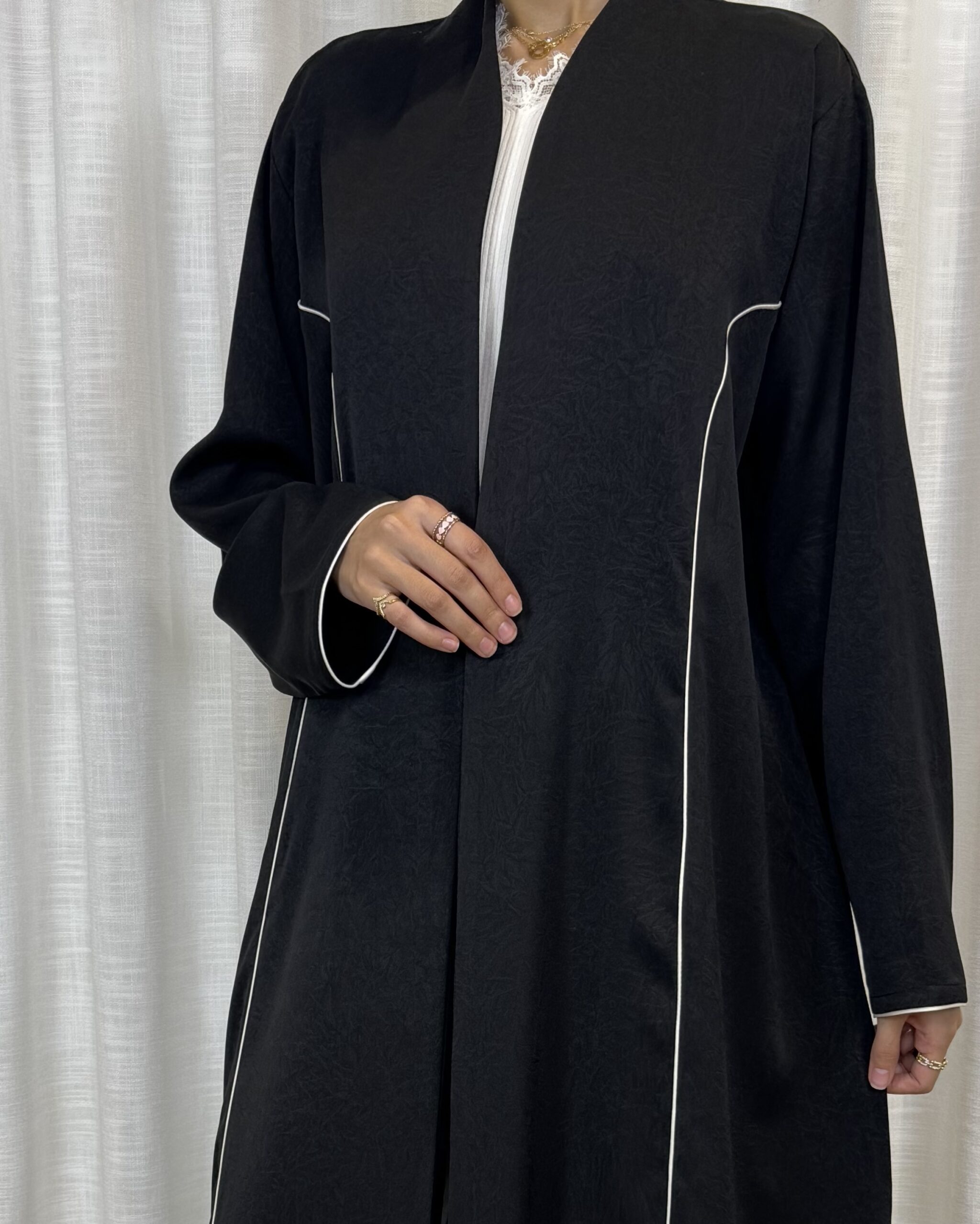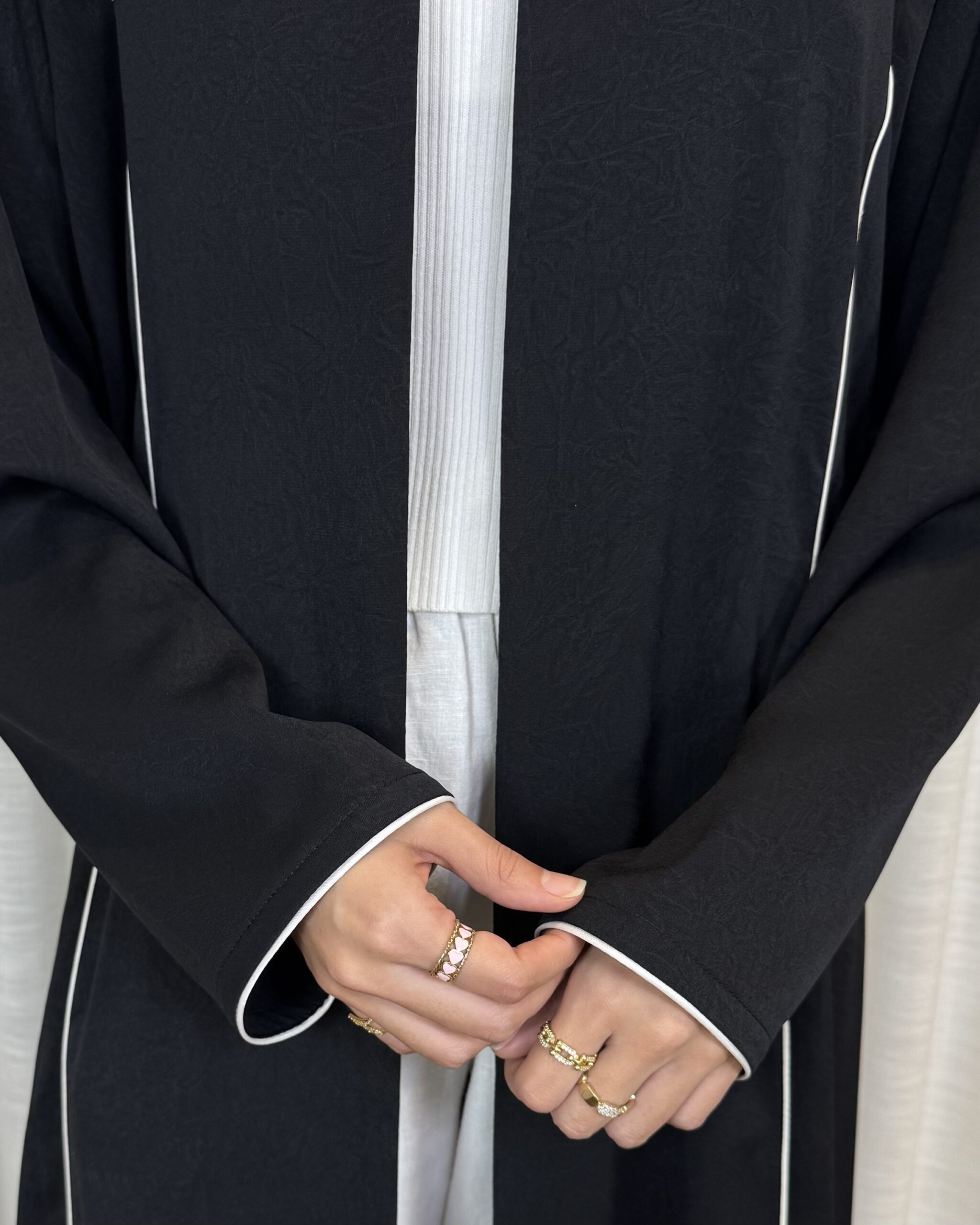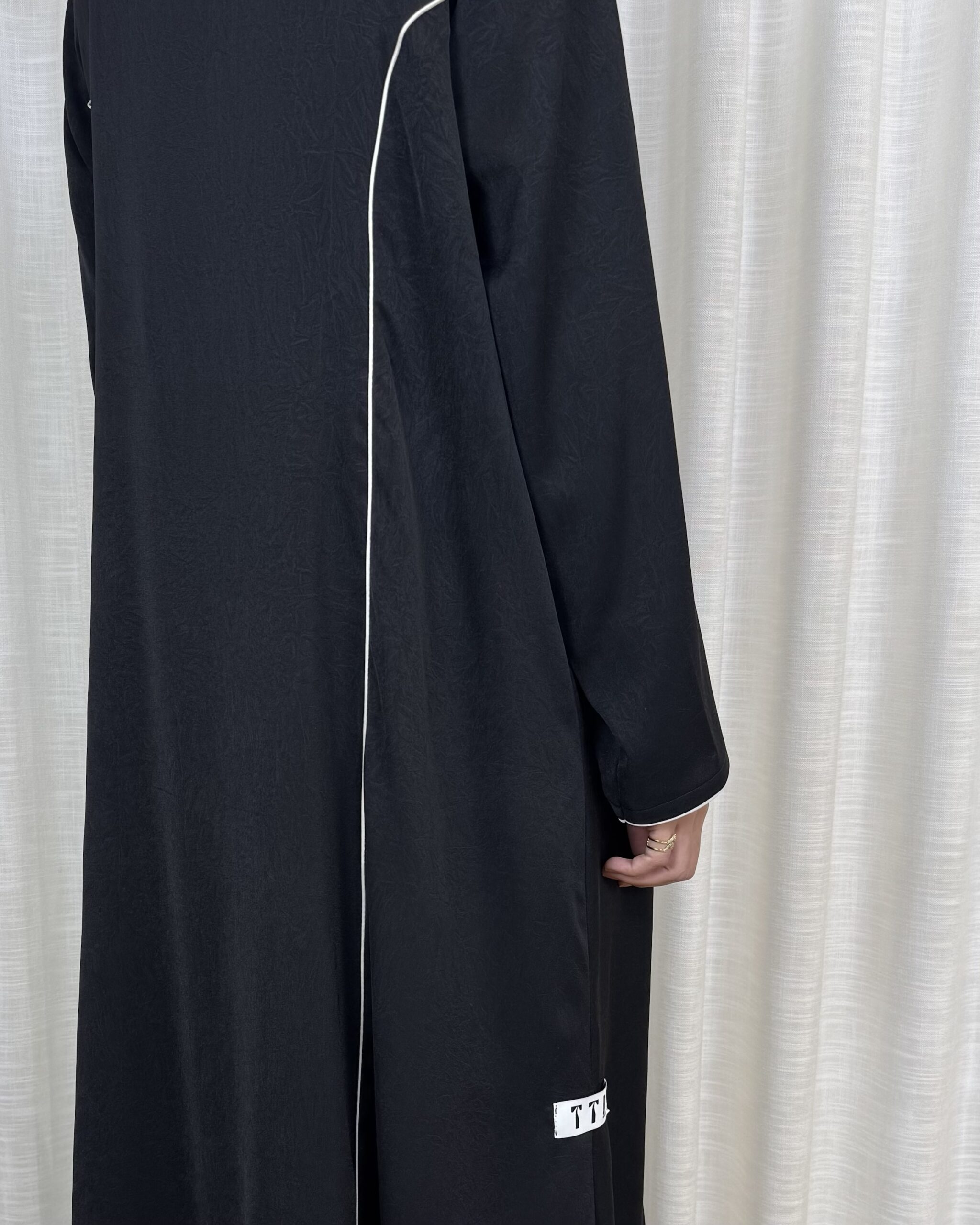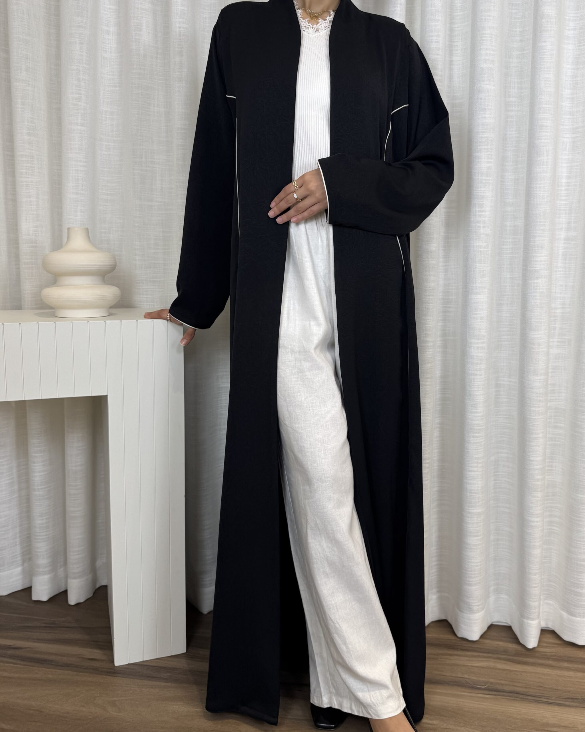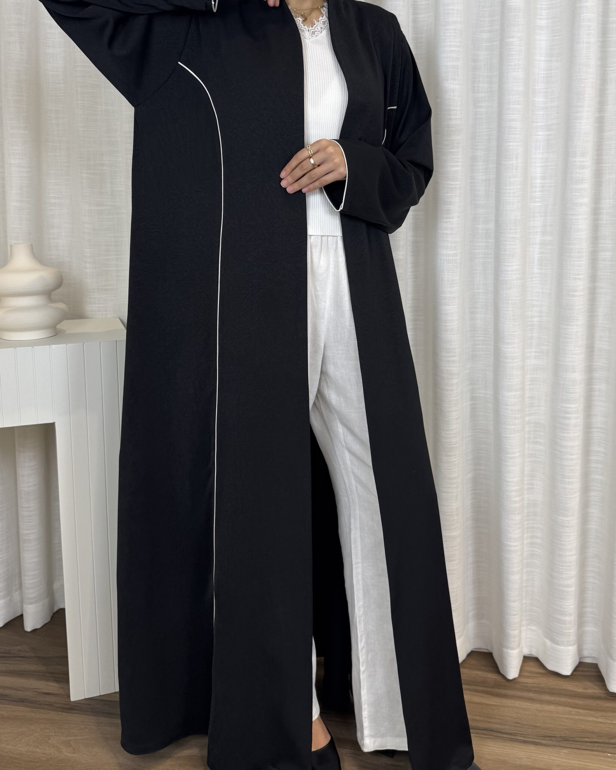 Classic black abaya with sharp white piping, minimal, clean, and effortlessly modern.