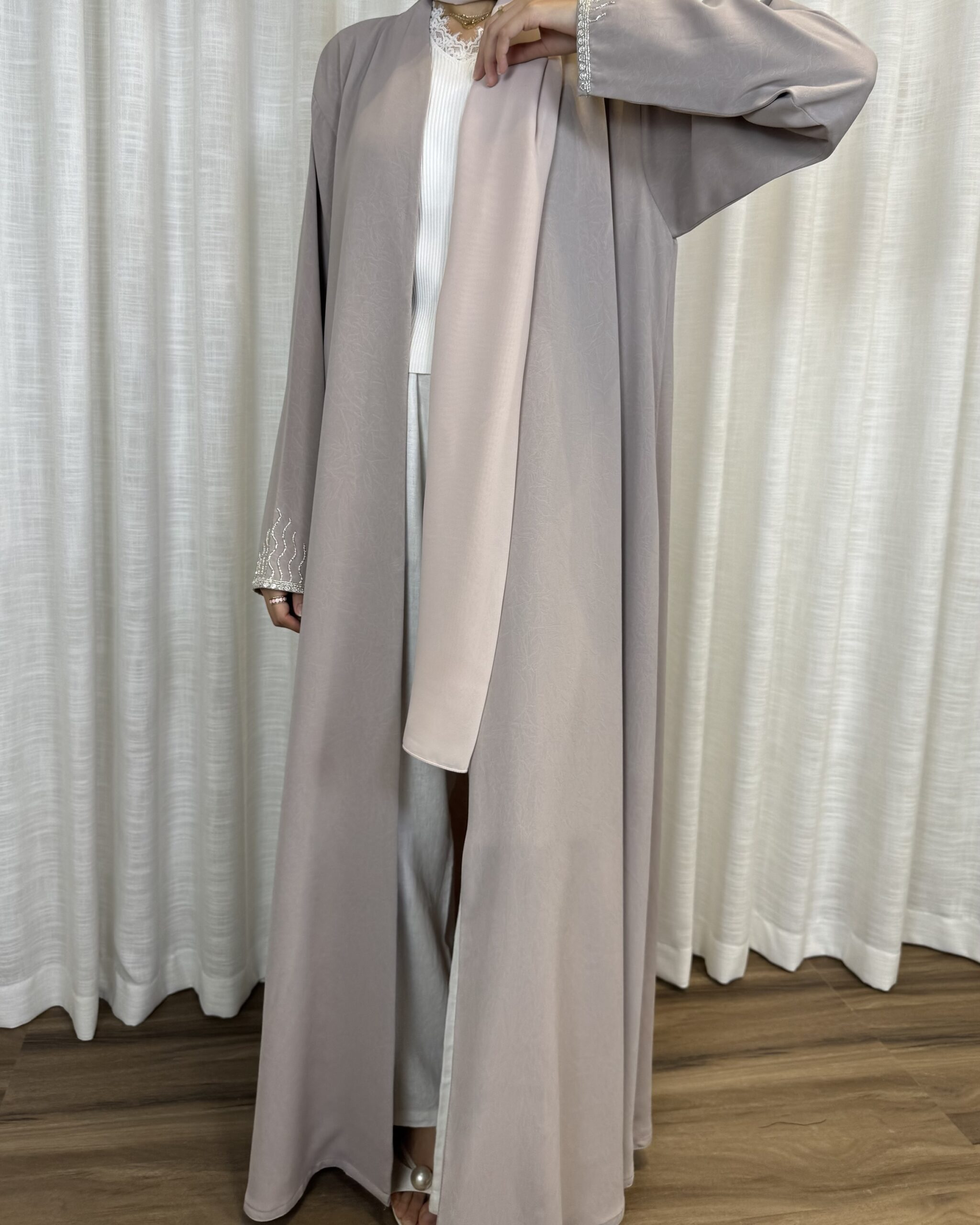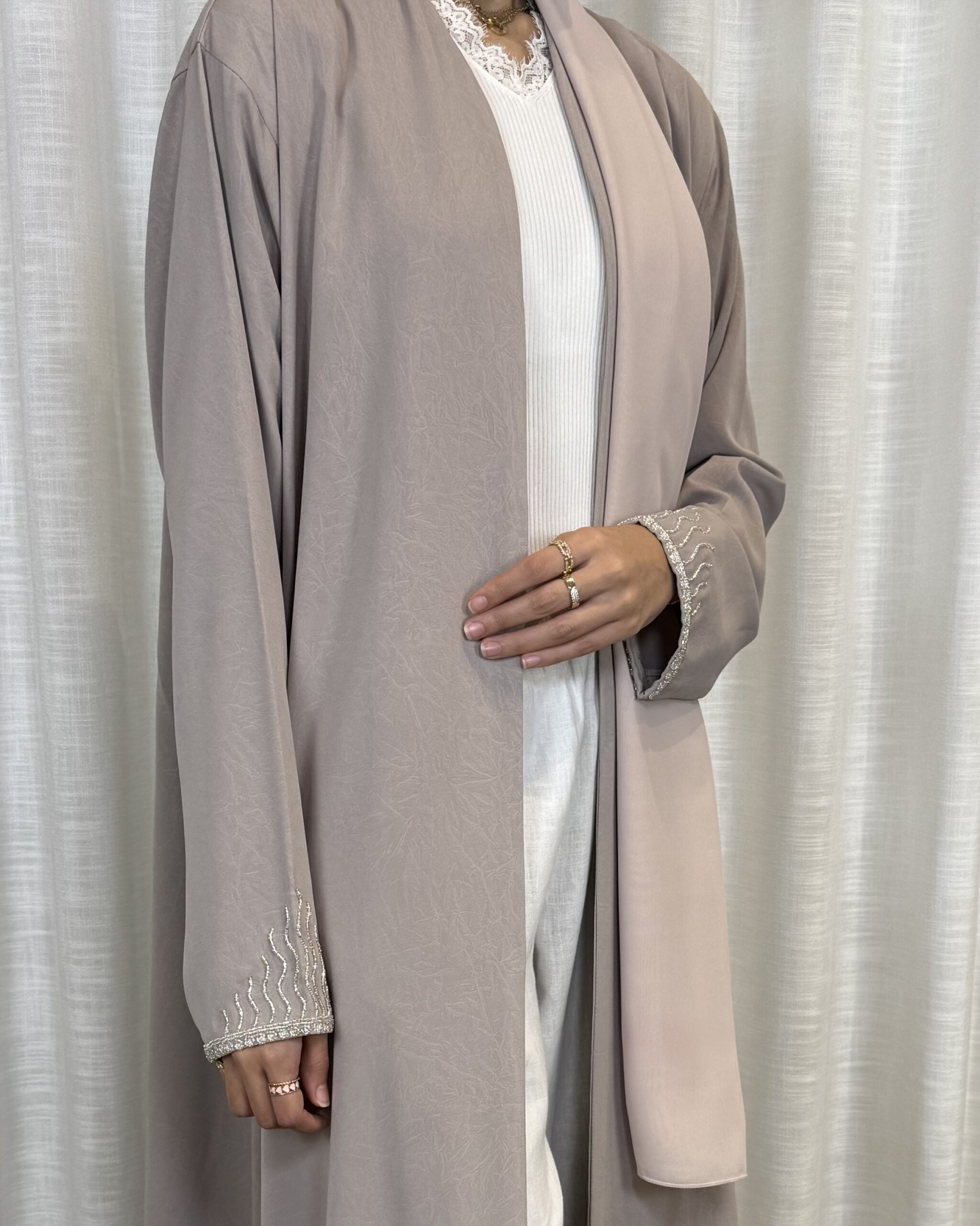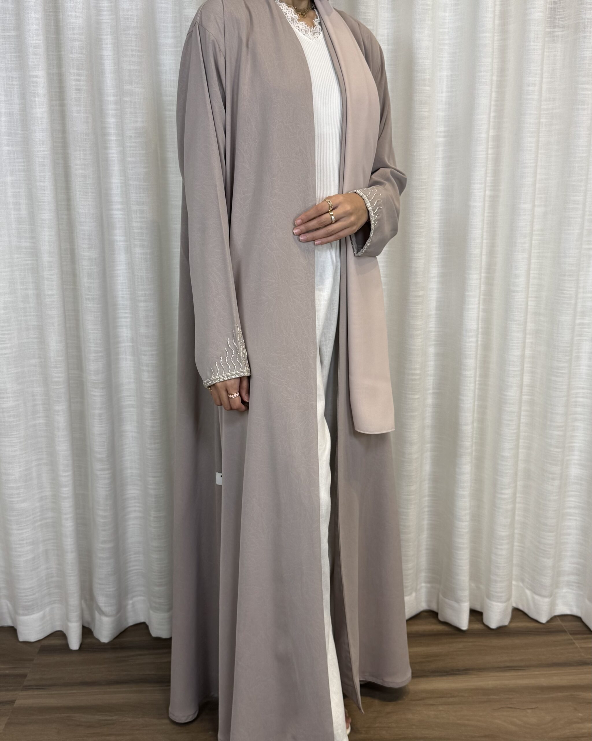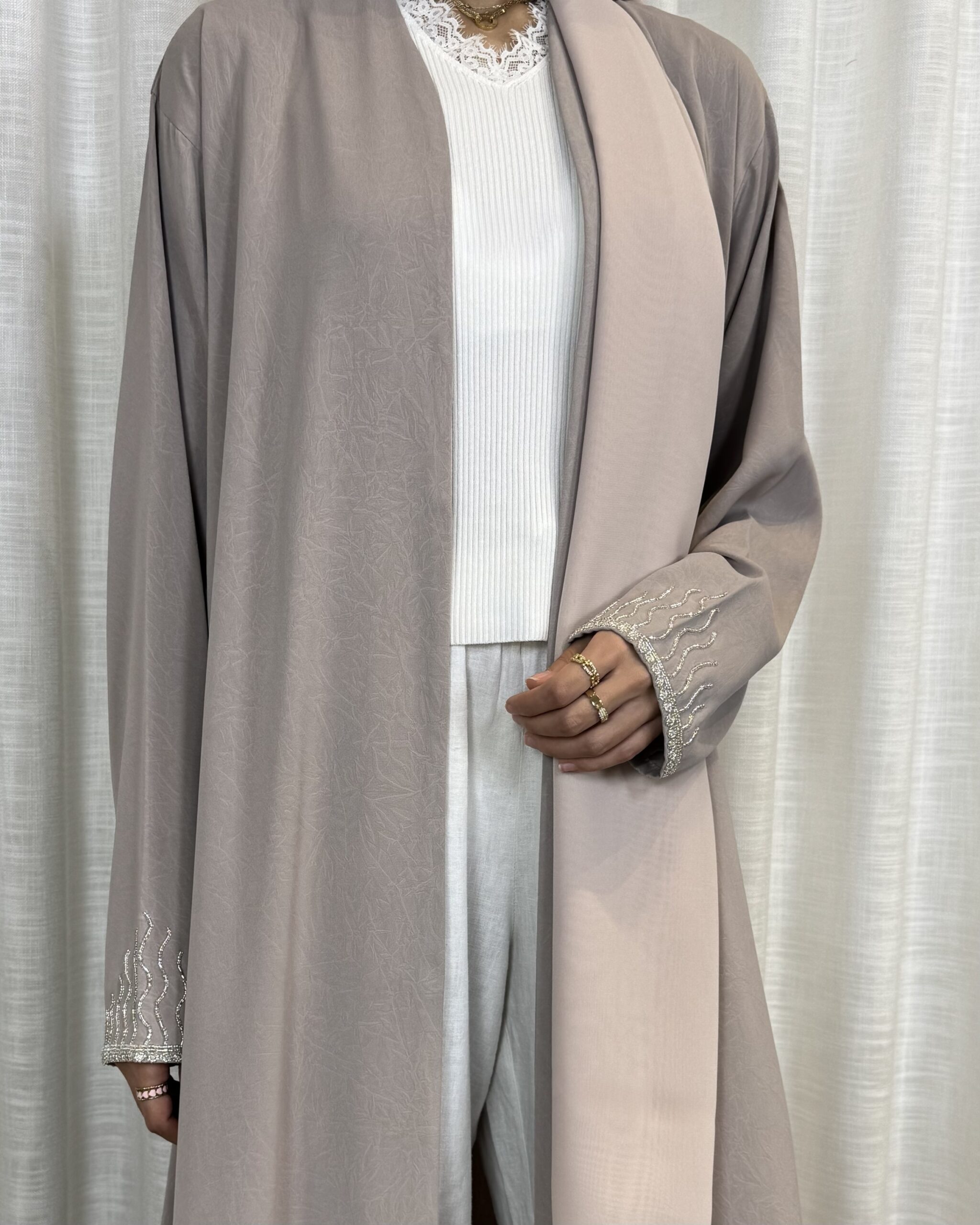 Light nude-toned abaya with soft embroidery on the sleeves, airy, feminine, and easy to wear.